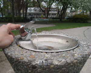 We got the water fountain fixed! (Update: The water fountain was removed during the playground renovation and a new one was finally installed in Spring 2016 – see above.)